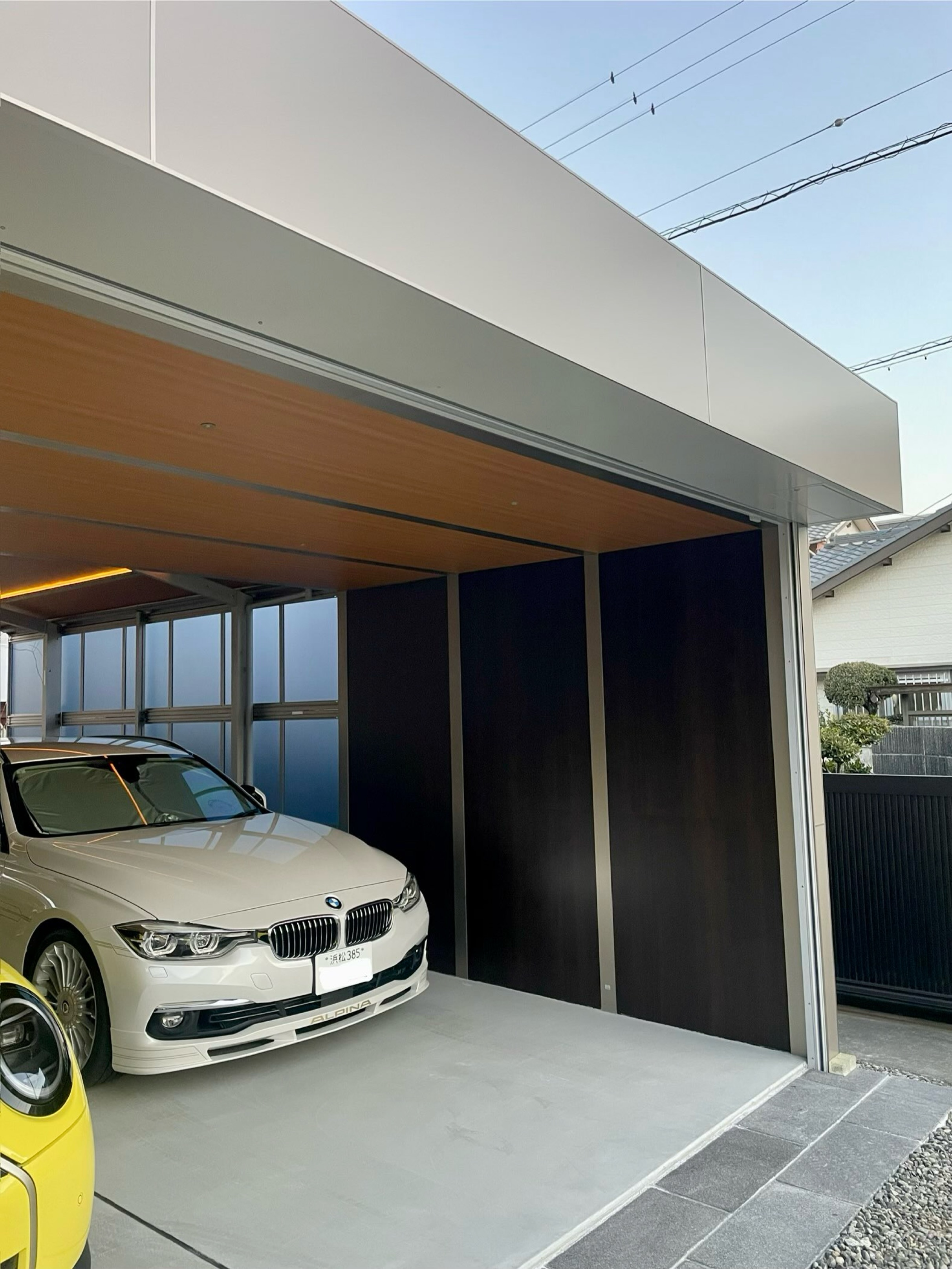 プラスGならではのフレーム構造による美しい水平ラインを活かし、 外部はシャープで重厚感のあるアルミパネル仕上げ、 内部は愛車を引き立てる木目調アルミパネルを採用。 外と内で表情を切り替えることで、邸宅のファサードとガレージ空間の両立を図っています。